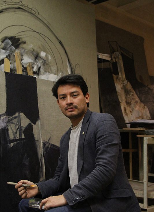 Formado en artes plásticas y arquitectura, su práctica se sitúa en la intersección entre materia, memoria y territorio. A través de pintura, escultura e instalación, desarrolla una investigación en torno a los símbolos de poder, las estructuras culturales y los procesos de transformación histórica. Su lenguaje visual integra materiales como aluminio reciclado, cobre, bronce, hoja de oro, textiles y pigmentos naturales, articulando una obra que oscila entre la abstracción, la arqueología simbólica y una lectura contemporánea de lo sagrado. Elementos recurrentes como el maíz, la cruz o la espada se convierten en dispositivos de reflexión sobre identidad, resistencia y memoria en el contexto latinoamericano.